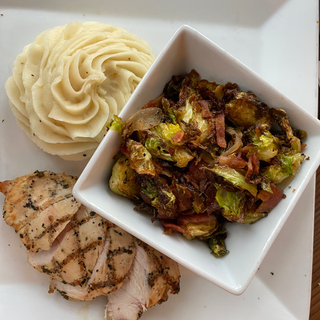 When dining out, one of my go to normally safe option is a meat, potatoe or rice, and vegetable. My vegetable is the picture is Brussel sprouts I also asked for a side of BBQ sauce